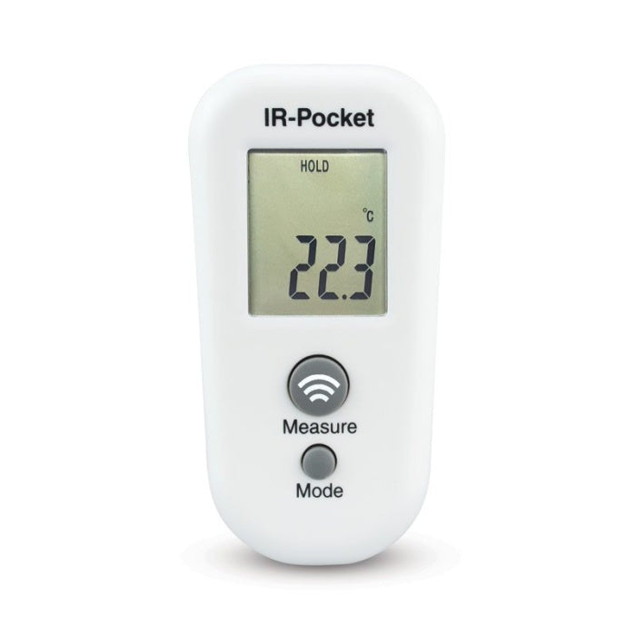 De IR‑Pocket infrarood thermometer is een compacte, contactloze temperatuursensor waarmee je snel en eenvoudig oppervlaktetemperaturen kunt meten zonder contact te maken met het object. Richt de thermometer op het oppervlak, druk op de meetknop en lees de temperatuur direct af op het overzichtelijke LCD‑scherm. Dankzij de handzame pocket‑formaat en eenvoudige bediening is dit instrument ideaal voor tal van toepassingen in keuken, werkplaats of technische omgevingen.