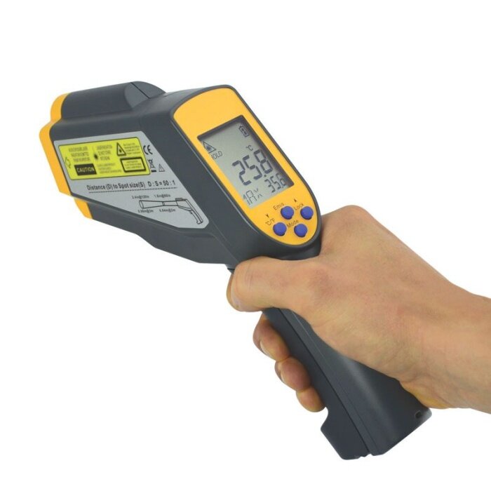 De RayTemp 38 infraroodthermometer is een professioneel instrument voor contactloze oppervlaktetemperatuurmetingen, ideaal wanneer je een klein doeloppervlak op afstand wilt meten. Dankzij de hoge afstand‑tot‑spot ratio van 50:1 kun je nauwkeurige metingen uitvoeren terwijl je op veilige afstand blijft – handig bij moeilijk bereikbare objecten of hoge temperaturen. Met de dual laser doelaanduiding richt je precies op het kleinste meetpunt en krijg je direct een betrouwbare temperatuur‑ en emissiviteitswaarde op het duidelijke, achtergrondverlichte LCD‑display.