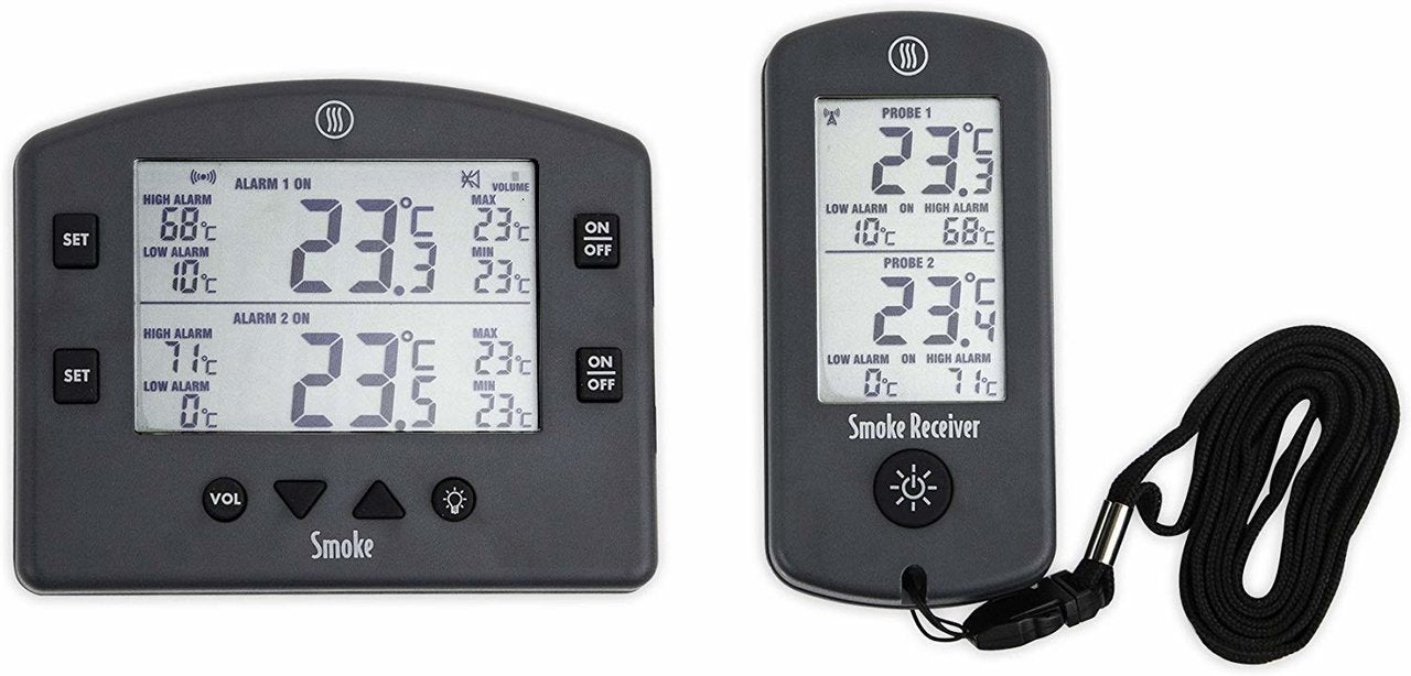 De Smoke Wireless Barbecue Thermometer is een robuust en veelzijdig draadloos temperatuursysteem voor barbecue, oven en roker. Deze thermometer maakt het eenvoudig om zowel de kerntemperatuur van het vlees als de omgevingstemperatuur van je BBQ of oven te controleren, zonder dat je steeds de deksel hoeft te openen. Het systeem wordt geleverd met een draadloze zender en een externe ontvanger, zodat je vanaf een afstand kunt zien hoe je bereiding vordert. De thermometer is vooraf gekoppeld met de ontvanger, waardoor je direct kunt starten zonder ingewikkelde setup.