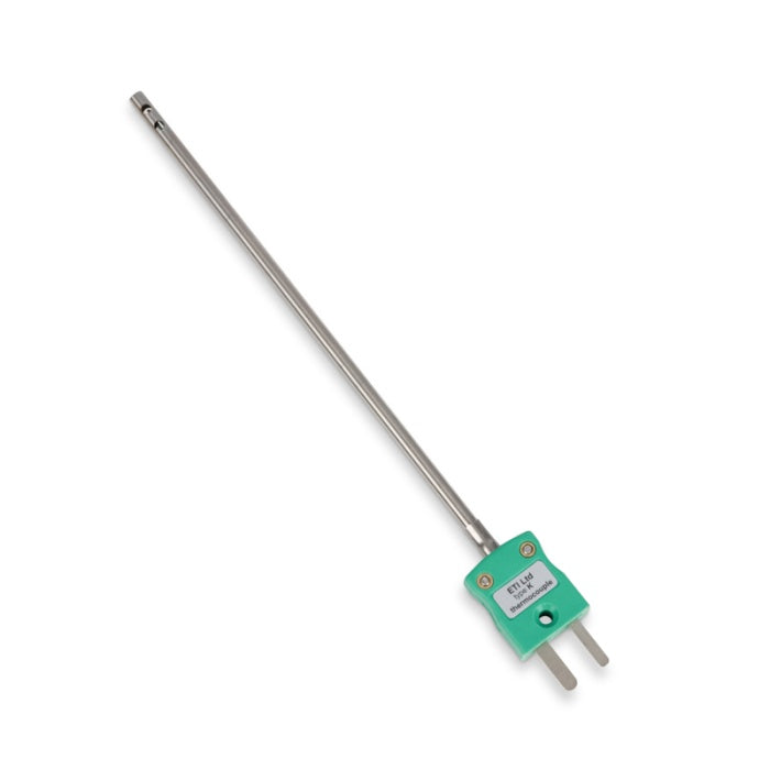 Thermokoppel temperatuursonde voor lucht of gas. Deze op de stekker gemonteerde temperatuursonde voor lucht/gas heeft een geperforeerde roestvrijstalen punt voor een snelle respons en is ideaal voor het meten van de temperatuur in koelcellen, koelkasten, vriezers en de HVAC-sector (airconditioning en verwarming).