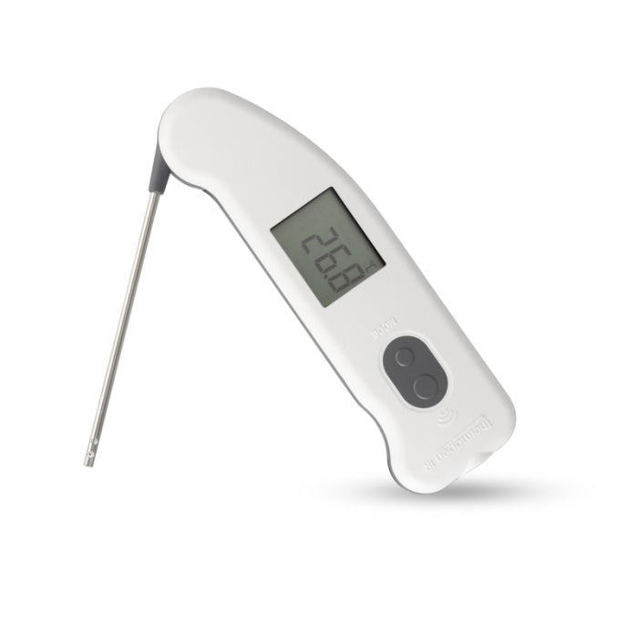 De Thermapen IR Air thermometer heeft een maximale/minimale temperatuurfunctie die toegankelijk is via de modusknop (alleen IR). De afstand tot het object is 5:1, daarom moet de thermometer zo dicht mogelijk bij het object worden geplaatst. De standaard emissiviteit is 0,95, maar kan indien nodig via de modusknop worden aangepast tussen 0,1 en 1,0.