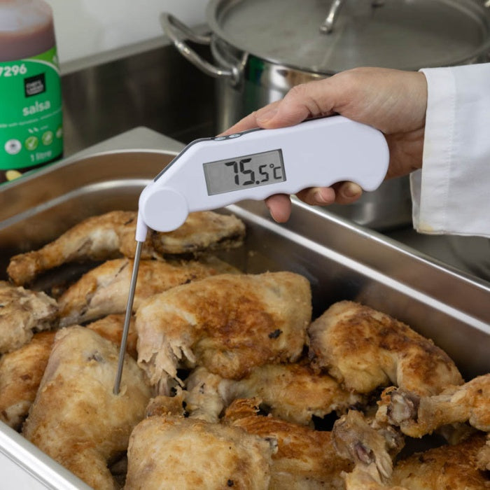 De waterbestendige Gourmet inklapbare thermometer met sonde is een gebruiksvriendelijke voedselthermometer, ideaal voor het bewaken van kook-, koel- en bewaartemperaturen van voedsel als onderdeel van HACCP- en gezondheids- en veiligheidsprocedures. Het apparaat meet temperaturen van -39,9 tot 149,9 °C met een resolutie van 0,1 °C/°F en is voorzien van twee drukknopschakelaars: aan/uit en vasthouden.